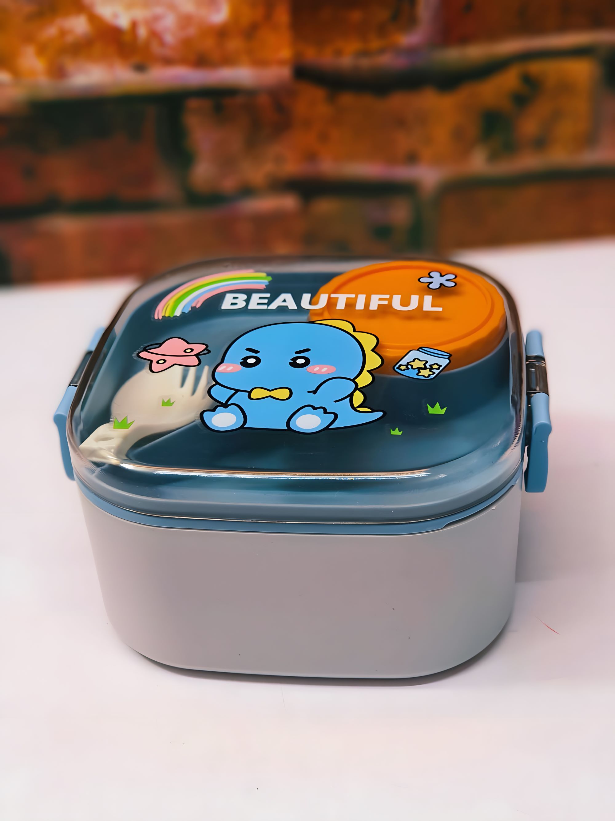 33+33 Ланч-бокс для їжі подвійний, зі столовим приладдям: ложка, ємність для соуса 65мл та окрема ємність з нержавіючої сталі 200мл. Виконаний з безпечного харчового пластику, який не має запаху, шкідливих домішок та не впливає на смак їжі. Кришка щільно закрив