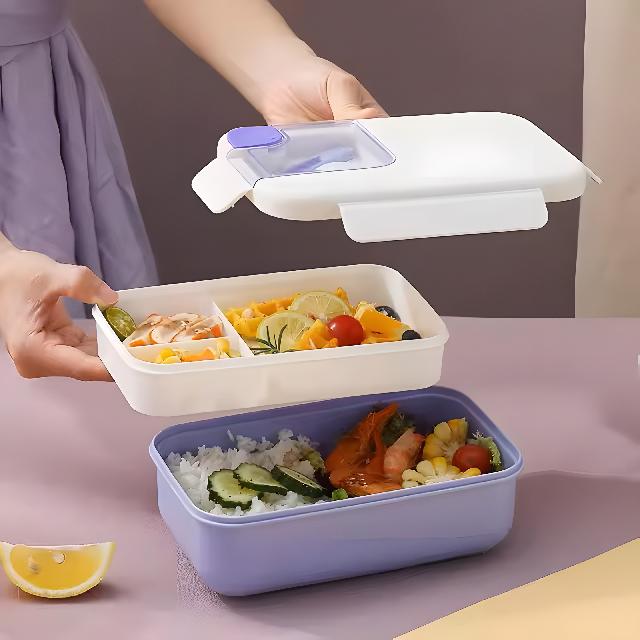 33+33 Ланч-бокс для їжі подвійний зі столовим приладдям: ложка-виделка. Верхній ярус має 3 секції, що запобігає змішуванню їжі, можна зберігати в контейнері різні страви одночасно. Виконаний з безпечного харчового пластику, який не має запаху, шкідливих домішо