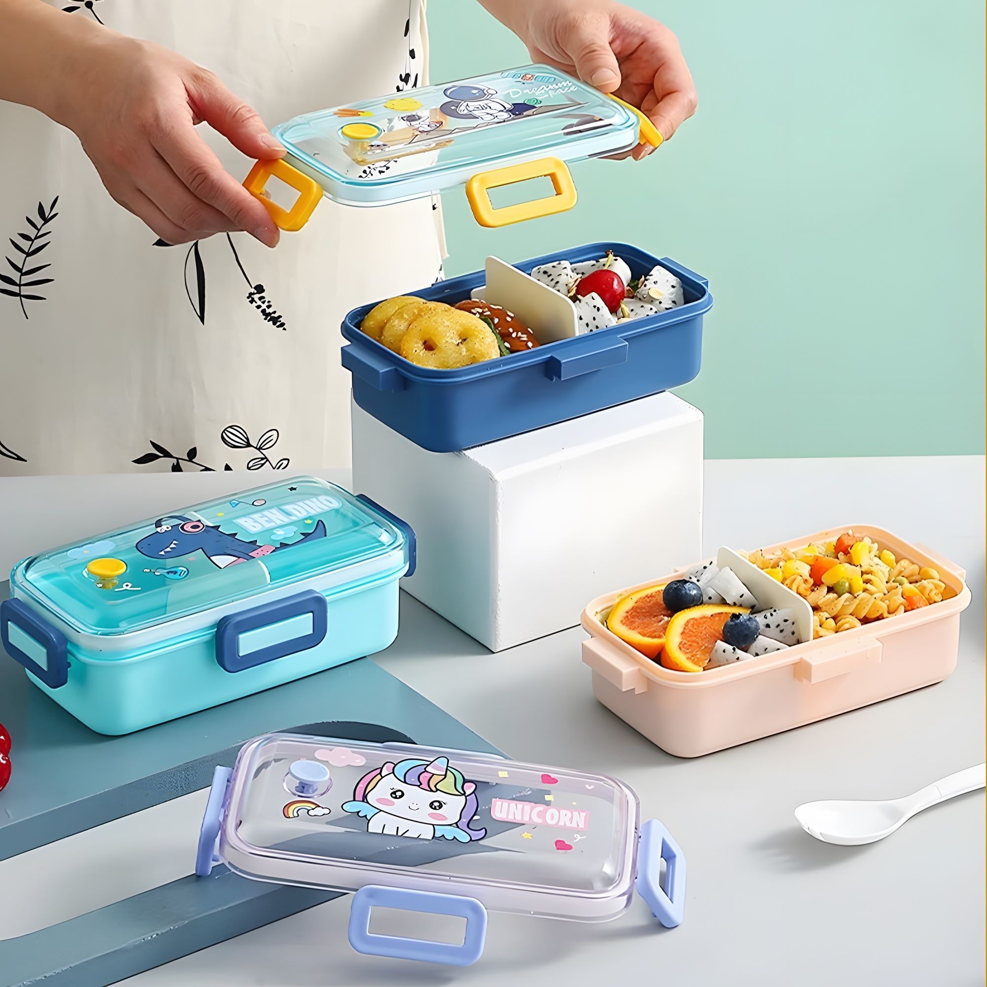 33+33 Ланч-бокс для їжі з розділювачем, зі столовим приладдям: ложка-виделка. Виконаний з безпечного харчового пластику, який не має запаху, шкідливих домішок та не впливає на смак їжі. Кришка щільно закривається та фіксується за допомогою надійних бічних засті