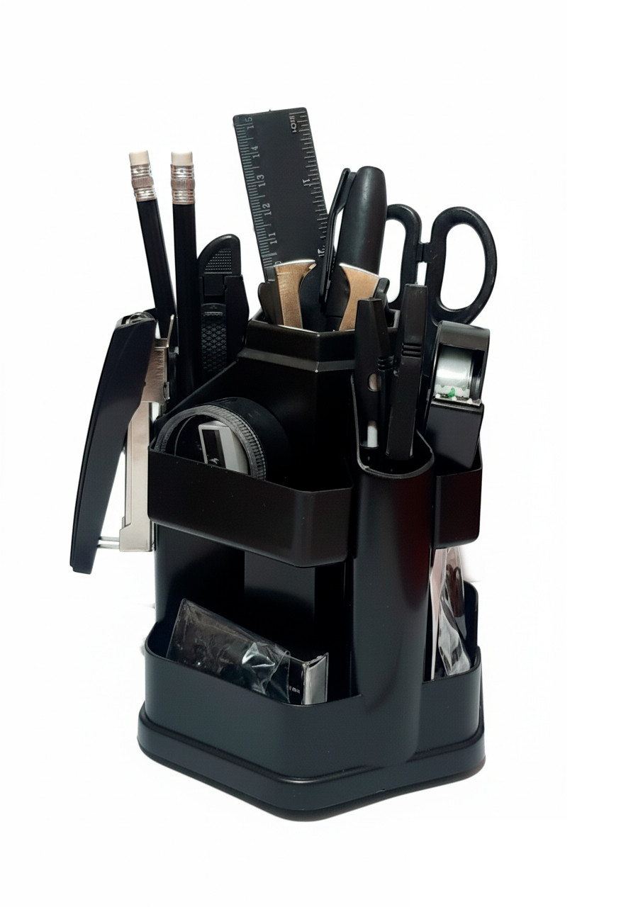 Набір настільний з наповненням на 17 предметів. Конструкція з обертовою пластиковою підставкою (360⁰), яка має 10 відділень. До набору входить: підставка, 2 ручки, 2 олівця чорногр., ножиці, степлер, скоби, антистеплер, ніж канцелярський, лінійка, точилка, ластик, скріпки, кнопки-гвіздки, папір для нотаток, диспенсер для скотча. Матеріал: пластик. Колір: чорний. Розмір: 146х148мм.