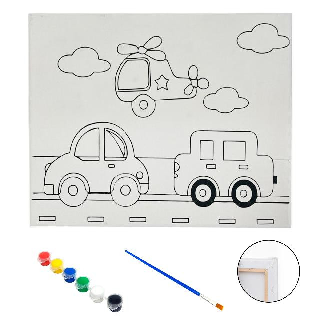 Полотно-розмальовка з контуром на дерев'яному підрамнику "Авто та гелікоптер", 15*20см., фарби + пензлик в наб., арт.QS15*20-3